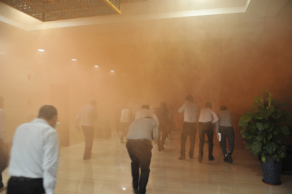 此次應(yīng)急演練活動(dòng)的場景設(shè)計(jì)為集團(tuán)總部大樓突發(fā)火警,人員受傷被困。當(dāng)天下午4時(shí),集團(tuán)應(yīng)急演練總指揮方旭下達(dá)應(yīng)急演練開始指令,隨后火警警報(bào)鳴響,應(yīng)急演練小組兵分兩組。一組承擔(dān)迅速撤離和自救任務(wù),現(xiàn)場演示樓層消防栓水帶、滅火器模擬使用,組織人員在煙霧場景下有條不紊地緊急疏散撤離,隨后開展對(duì)嚴(yán)重?zé)齻麄麊T的緊急營救;另一組快速穿戴消防防護(hù)設(shè)備,展開消防水帶,接通出水,并在一樓廣場空曠地帶點(diǎn)燃模擬著火桶,演示干粉滅火器滅火要領(lǐng)。本次應(yīng)急演練活動(dòng)檢驗(yàn)了集團(tuán)各級(jí)各單位應(yīng)對(duì)火災(zāi)應(yīng)急處置的能力,同時(shí)也進(jìn)一步普及火災(zāi)應(yīng)急處置與防災(zāi)減災(zāi)知識(shí),有效提高了參演和觀摩人員風(fēng)險(xiǎn)防范意識(shí)和自救互救能力。