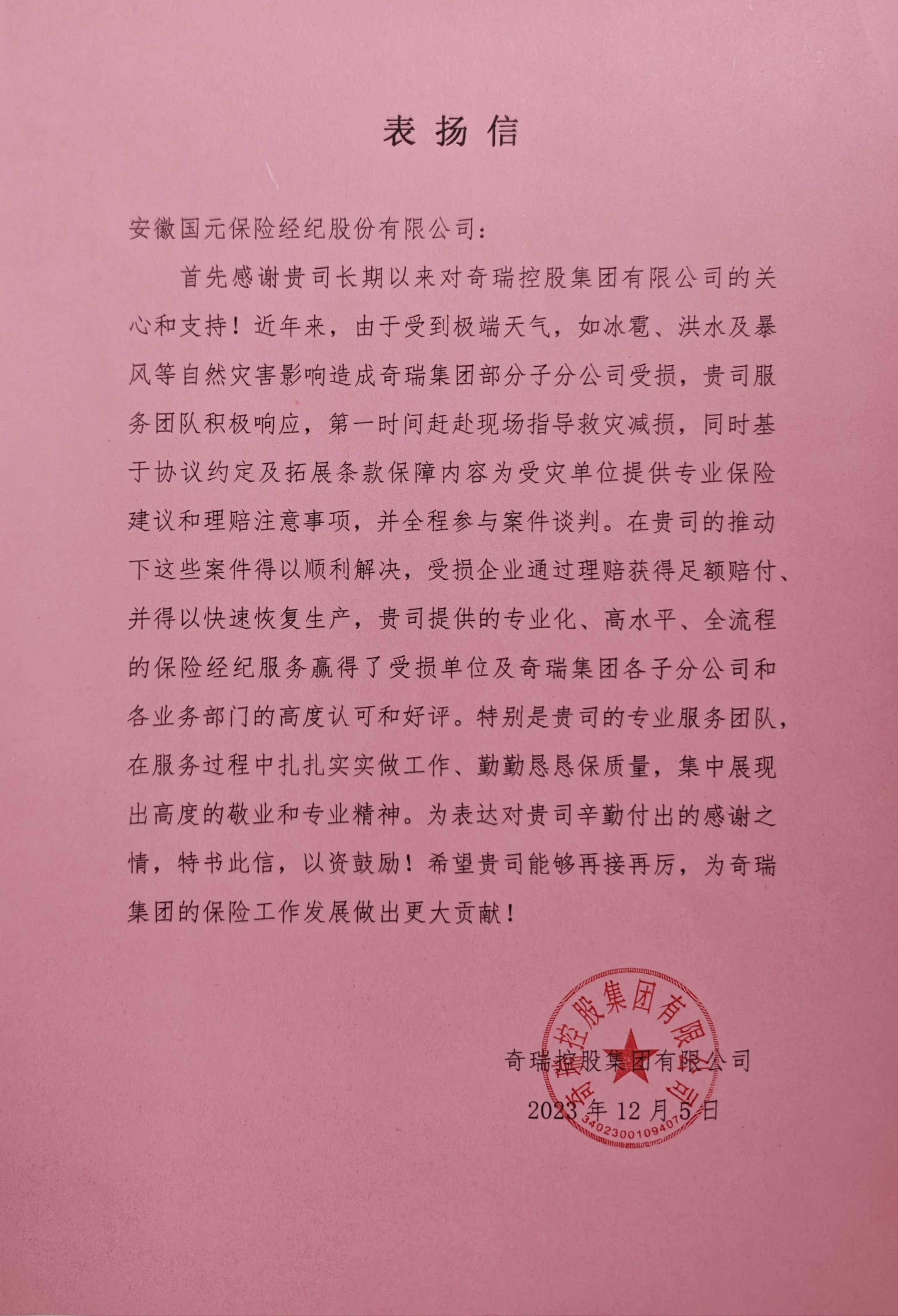 奇瑞集團(tuán)在表?yè)P(yáng)信中特別提到,國(guó)元保險(xiǎn)經(jīng)紀(jì)在服務(wù)過(guò)程中扎實(shí)工作,勤勉盡責(zé),展現(xiàn)出高度的敬業(yè)和專業(yè)精神,贏得了受損單位、奇瑞集團(tuán)各子分公司及各業(yè)務(wù)部門(mén)的高度認(rèn)可和好評(píng)。